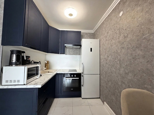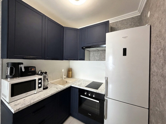 Заезжай и живи: Мы оставляем вам почти всё! Стильный кухонный гарнитур в глубоком синем цвете, варочную поверхность, духовой шкаф, холодильник. В комнатах остаются шкаф и комоды, в ванной — подвесная тумба. Вам останется только перевезти личные вещи.